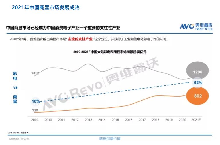奥维云网(AVC)董事长文建平表示,从规模变化来看,商显行业是一个持续增长的行业,销售额从2009年的130亿到2021预计达到的800亿,这十多年来年复合增加率接近6成。商用显示领域已经成为液晶显示等产品最主要的国内新增产能消化口。尤其是在5G商用网络、智能社会加速到来,显示终端作为重要的信息窗口,商用显示的应用价值在不断放大。