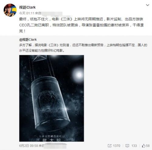 6月3日,就有微博网友爆料,“经多方了解,电影《三体》烂到渣,国人水平还没能力拍好科幻电影。”今日(6月17日),该网友又转发了此消息,并补充道,电影《三体》将无限期推迟上映,影片监制、出品方游族CEO孔二狗已离职,特效团队也被更换。