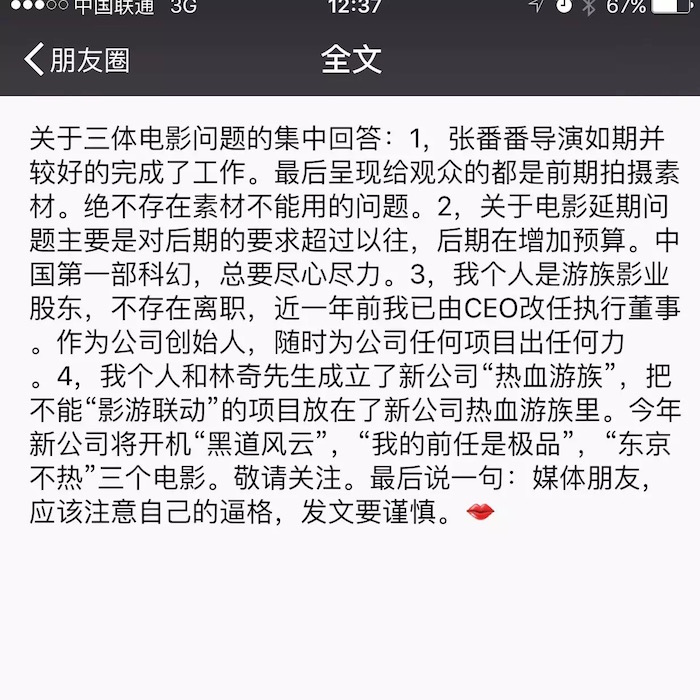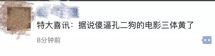 事实上,《三体》电影项目被推迟的传闻由来已久,2016年1月份,就有知情人士在朋友圈称“孔二狗的《三体》黄了”。但此时并没有引起影迷的广泛关注。