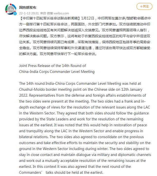 据@国防部发布,1月12日,中印两军在莫尔多/楚舒勒会晤点中方一侧举行第十四轮军长级会谈,两国国防、外交部门代表参加。双方继续就推动中印边界西段实控线地区有关问题解决坦诚深入交换意见。双方同意遵照两国领导人指引,尽快解决剩余问题。双方表示,这将有助于恢复西段实控线地区的和平与安宁并促进双边关系。双方同意持续巩固已有成果,采取有效措施,保持西段地区包括冬季的局势安全稳定。双方同意继续保持军事和外交渠道沟通,通过对话协商尽快达成双方都能接受的解决方案。双方同意尽快举行下一轮军长级会谈。