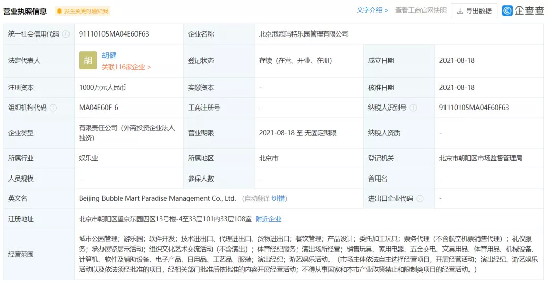 早在2021年8月份,泡泡玛特注册成立了北京泡泡玛特乐园管理有限公司,注册资金为1000万元,其主营业务包含了城市公园管理、游乐园、游艺娱乐活动等,被视为泡泡玛特入局主题乐园市场的正式官宣。而之所以有资本可以进入这一领域,也是基于其鲜明的IP属性,相关资料显示,泡泡玛特共运营有93个IP,其中包括Molly、Dimoo等12个自有IP,以及PUCKY、The Monsters等25个独家IP。