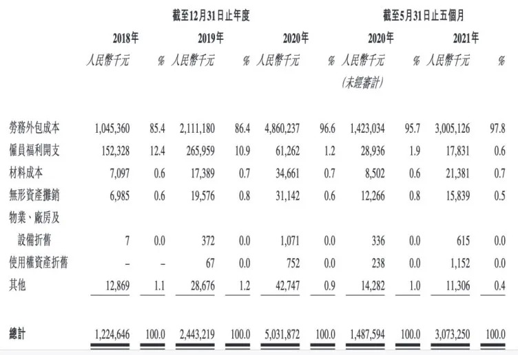 其中,劳务外包成本分别为10.45亿元、21.11亿元及48.6亿元,且占当期营业成本的比重不断上升,从2018年的85.4%上升到了2020年的96.6%;雇员福利开支占营业成本的比重则从2018年的12.4%下降到了2020年的1.2%。