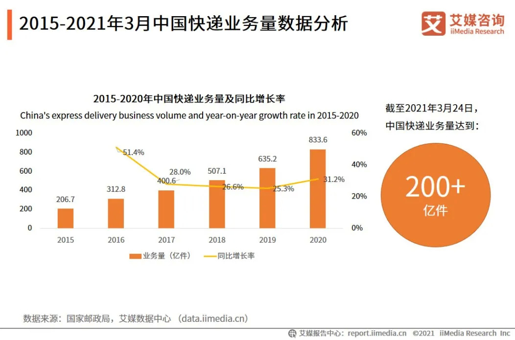艾媒网报告显示,2015-2020年中国快递服务行业业务量保持稳定上升的趋势,从2015年的206.7亿件增长到了2020年的833.6亿件,2021年截至3月24日,业务量即已超过了200亿件,与2015年全年业务量相当。
