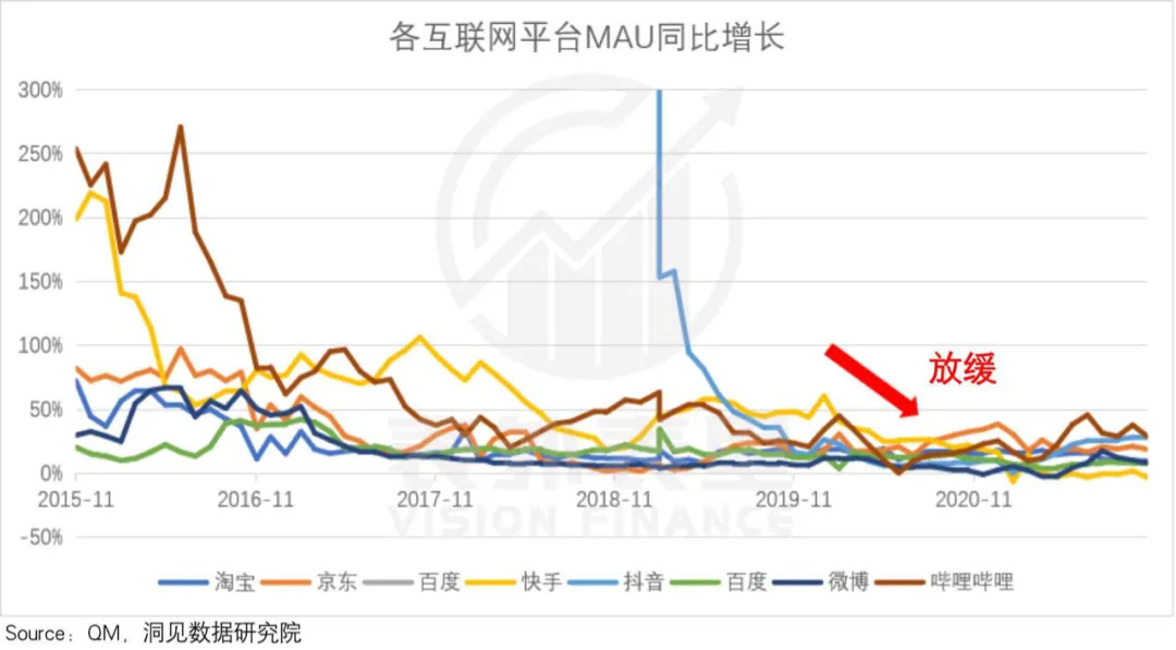 可以看到,2020年以来,互联网人口红利见顶,各广告平台的用户增速,集体持续放缓。