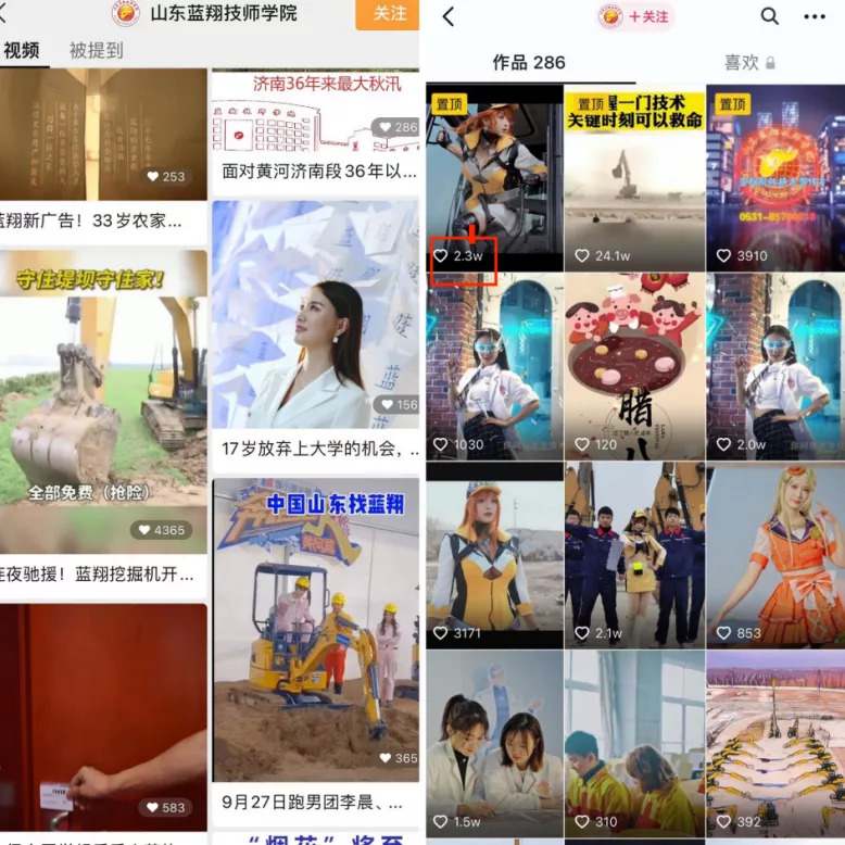 浏览蓝翔技校的社交媒体账号发现,抖音号拥有18.1万粉丝,仅有个别视频点赞量突破10万,多数视频的数据并不亮眼。微信视频号方面,此次刷屏的《视觉盛宴,学姐陪你开飞车》也成为第一条点赞超过10万的作品。绝大多数视频的点赞量在几十到几百间不等。微博上粉丝数仅为14.8万。