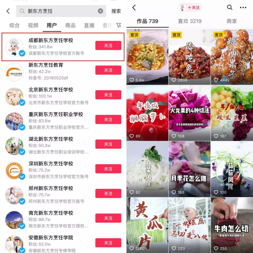 新东方烹饪的情形同样黯淡,在抖音搜索发现,各地新东方烹饪学校几乎都有自己的抖音号。从粉丝数量最高341.8万的成都新东方烹饪学校看,其作品点赞量也少有破万的情形。