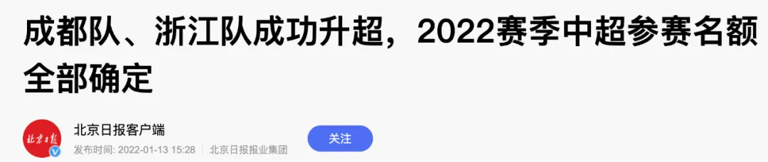 目前2022年赛季中超的参赛名额全部确定,18支球队为:
