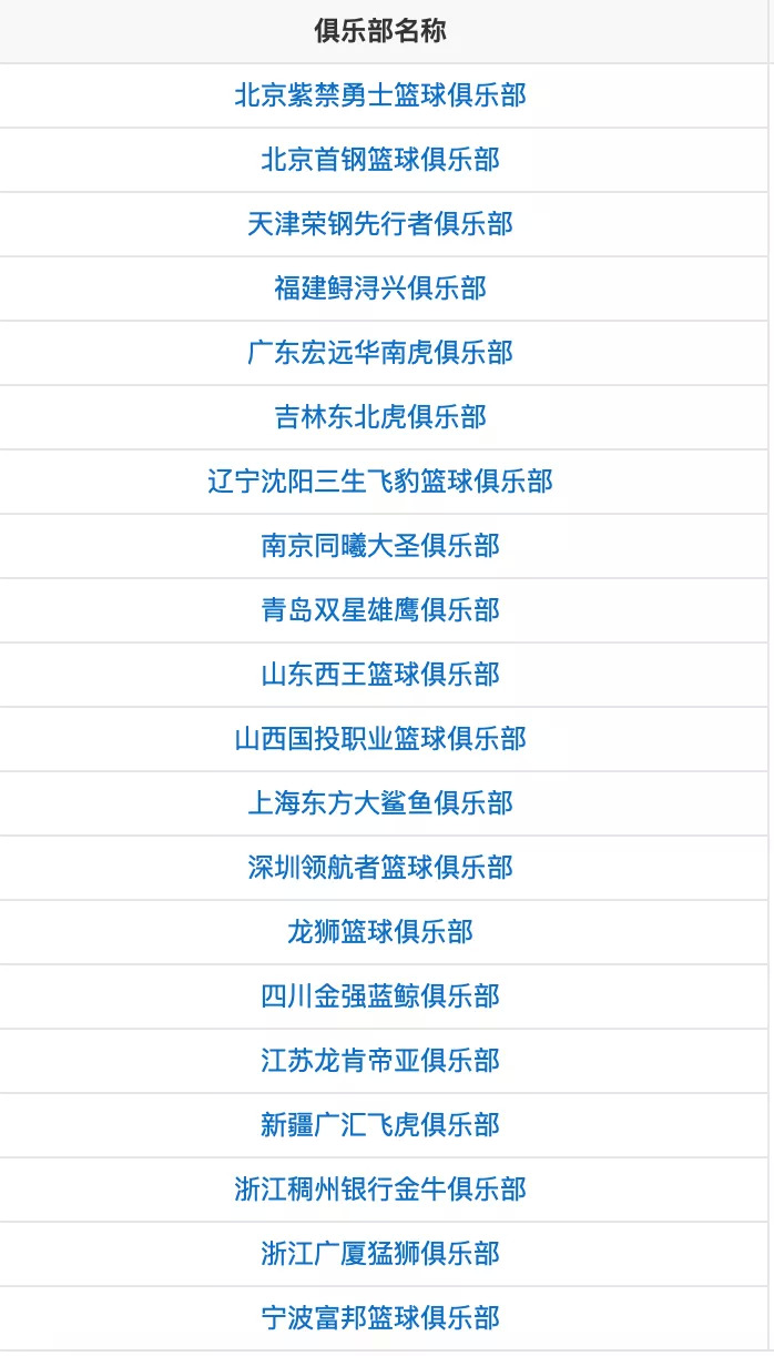 目前,CBA的20个俱乐部为: