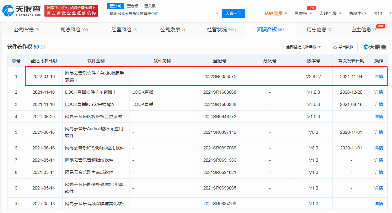 天眼查App显示,杭州网易云音乐科技有限公司“网易云音乐软件(Android版手表端)”获得登记批准,登记号为2022SR0056575,批准日期为2022年1月10日,当前版本号为V2.9.27。