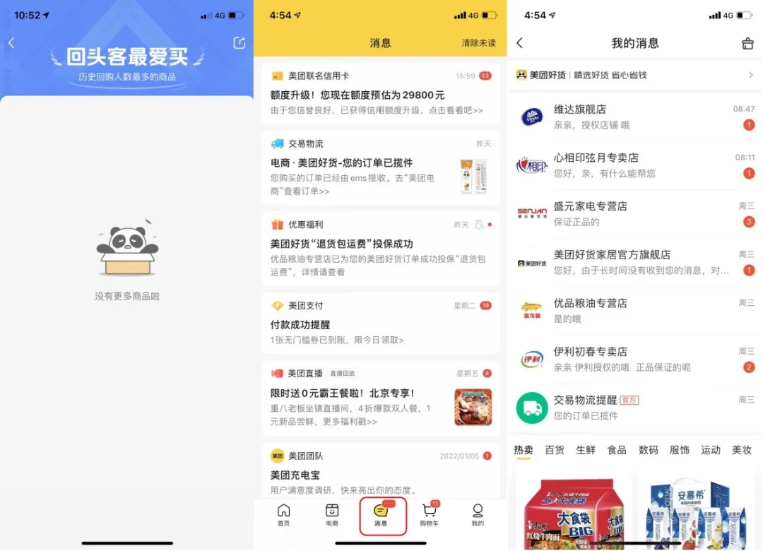 从购物体验上看,鉴于“美团电商”首页推荐多为单价较低的零食,价格与拼多多、京东等平台相差无几。不过,其特色是一件就能包邮,不需要拼多多的拼团,也没有京东的运费,这一点体验比较好。但不足地方也很多,比如页面无缘无故出现BUG;比如用户与商家的聊天界面,很容易误点底部“消息”导航栏,这里的消息并非电商业务的,而是所有美团业务的消息都在这里;比如商品品质,虽然美团用“金牌商家”、“美团确保质量”等为商家背书,但遇到不承诺“假一赔十”的商家,用户还是会质疑;比如SKU问题,点击手机数码进去看到的多为充电宝、数据线、手机膜等配件产品,点击家用电器也多为厨房小家电,较少电视、冰箱、空调等大件。这些品类与美团吃喝玩乐的氛围倒是挺搭,但对于想买手机、电脑、大件家电的用户来说,总有一种不靠谱的感觉。