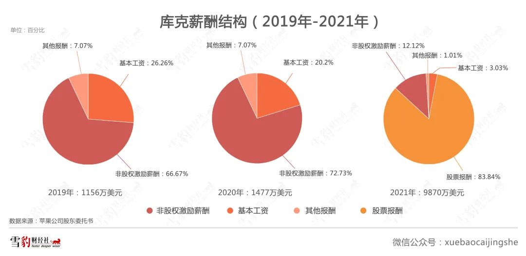 不过,这些并不包括库克此前的历史“积存”。2021年,库克其实还另外还获得了价值7.54亿美元(约合48亿元人民币)的500多万股股票。这些股票是他2011年出任CEO时所获薪酬方案的一部分,只是它们到2021年才有资格行权,所以苹果官方并没有将其归入2021年的薪酬中。