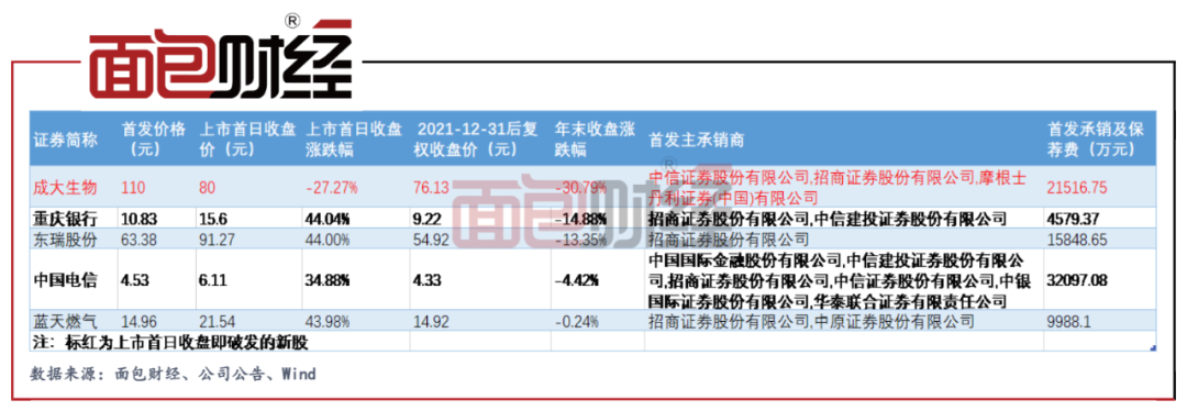 在招商证券主承销的五只新股中,2021年10月28日,成大生物的股价在上市首日收盘就跌破发行价,截至2021年年末收盘,公司股价跌幅超三成。考虑到首发机构配售的股份有6个月的限售期,招商证券的获配新股存在浮亏。