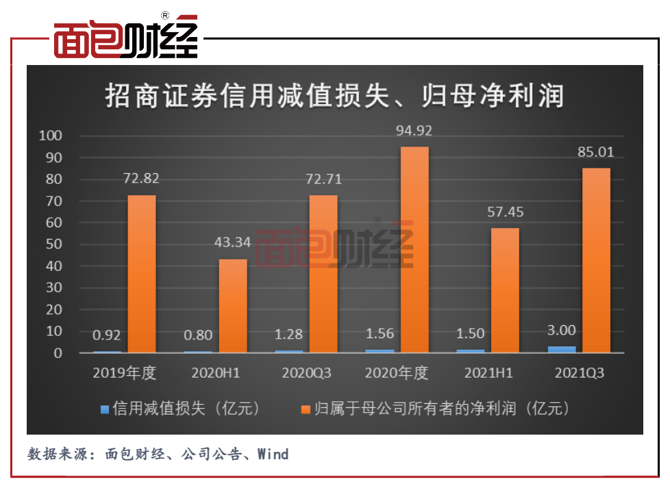2021年上半年和前三季度,招商证券分别确认信用减值损失1.5亿元和3亿元,同比分别增加87.19%和134.86%,信用减值损失持续扩大对公司的利润产生影响。2021年第三季度,公司产生营收74.41亿元,同比增长16.18%,但归母净利润为27.56亿元,同比下降6.18%,期间增收不增利。