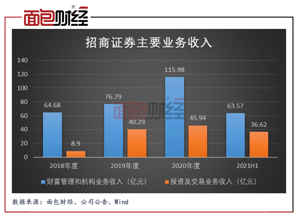 2021年上半年,招商证券主要的两大业务财富管理和机构业务、投资及交易业务分别产生收入63.57亿元和36.62亿元,同比分别增加25.51%和55.42%,合计占当期总营收近七成。
