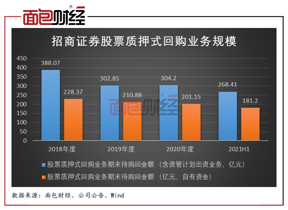 2021年上半年,招商证券确认信用减值损失1.5亿元,其中1.43亿元为买入返售金融资产(即股票质押式回购业务)发生的减值损失。与之相对地,报告期间,公司股票质押式回购业务规模下降,使得股票质押式回购利息收入同比下降4.36%。