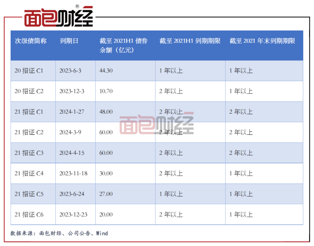 自2020年年末至2021年上半年,招商证券多次发行长期次级债用于补充次级债。根据《证券公司次级债管理规定》,长期次级债到期期限在3、2、1年以上的,原则上分别按100%、70%、50%的比例计入净资本,随着到期期限的缩短,公司次级债可计入净资本的比例将下调。