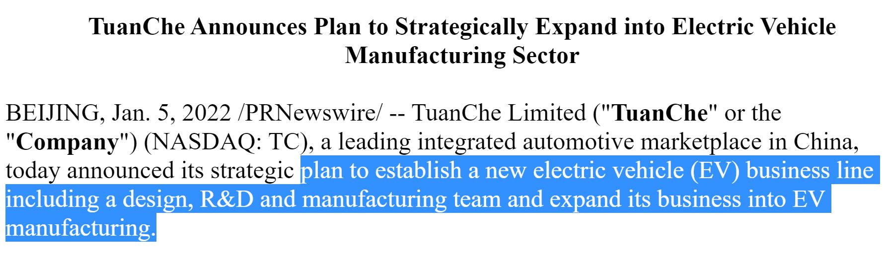 1月5日晚间,国内汽车交易和服务平台团车网(TC.NASDAQ)发布公告称正式建立新型电动汽车的战略计划业务线,包括设计、研发和制造团队,并将其业务扩展到电动车制造。
