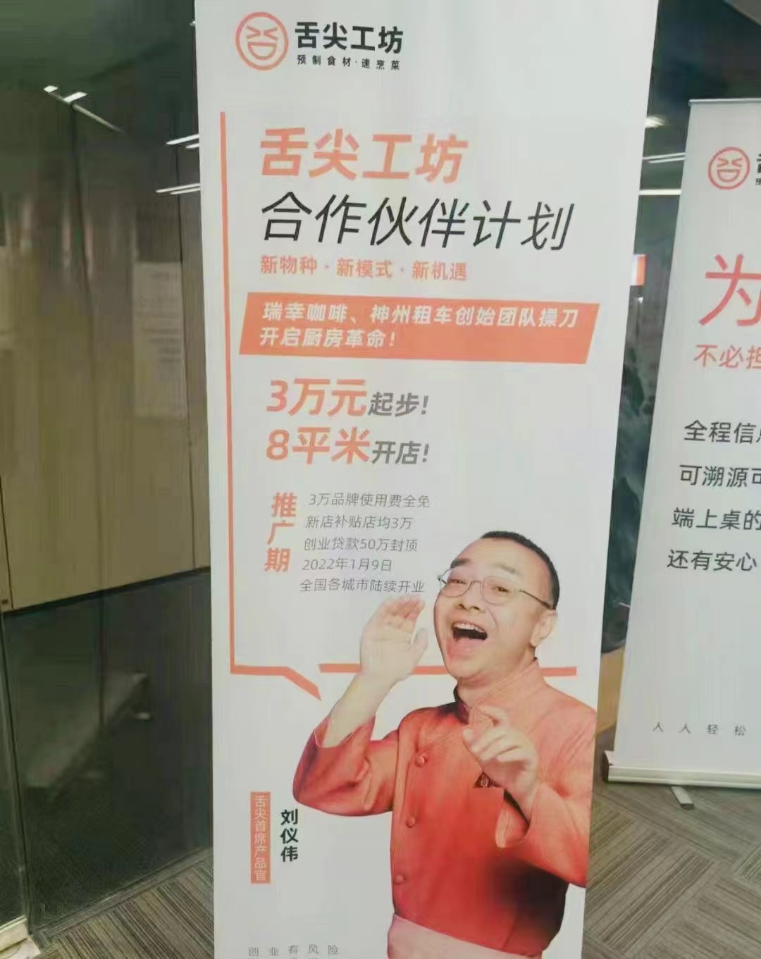 界面新闻在一位舌尖工坊招募人员的朋友圈里看到,刘仪伟的头像被印在易拉宝宣传纸上。刘仪伟曾主持烹饪电视节目,也是舌尖科技的首席产品官。