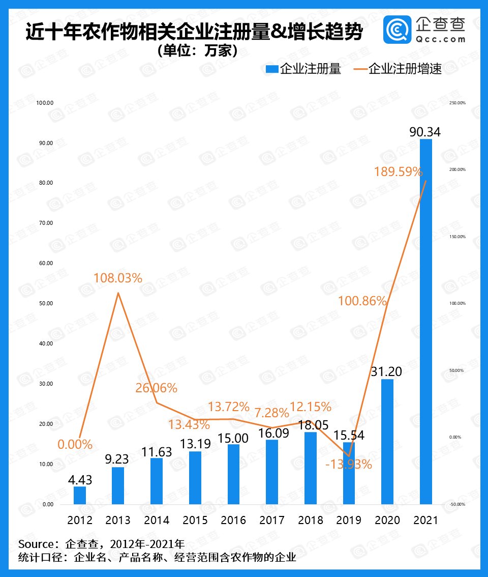 企查查数据显示,我国现存农作物相关企业208.70万家,近十年来注册量不断增长,特别是2021年,我国新增农作物相关企业90.34万家,同比增长189.59%,是十年前的20倍。具体来看,2021年新增农作物相关企业多为农作物种植专业合作社、农作物家庭农场、农作物育种相关企业。