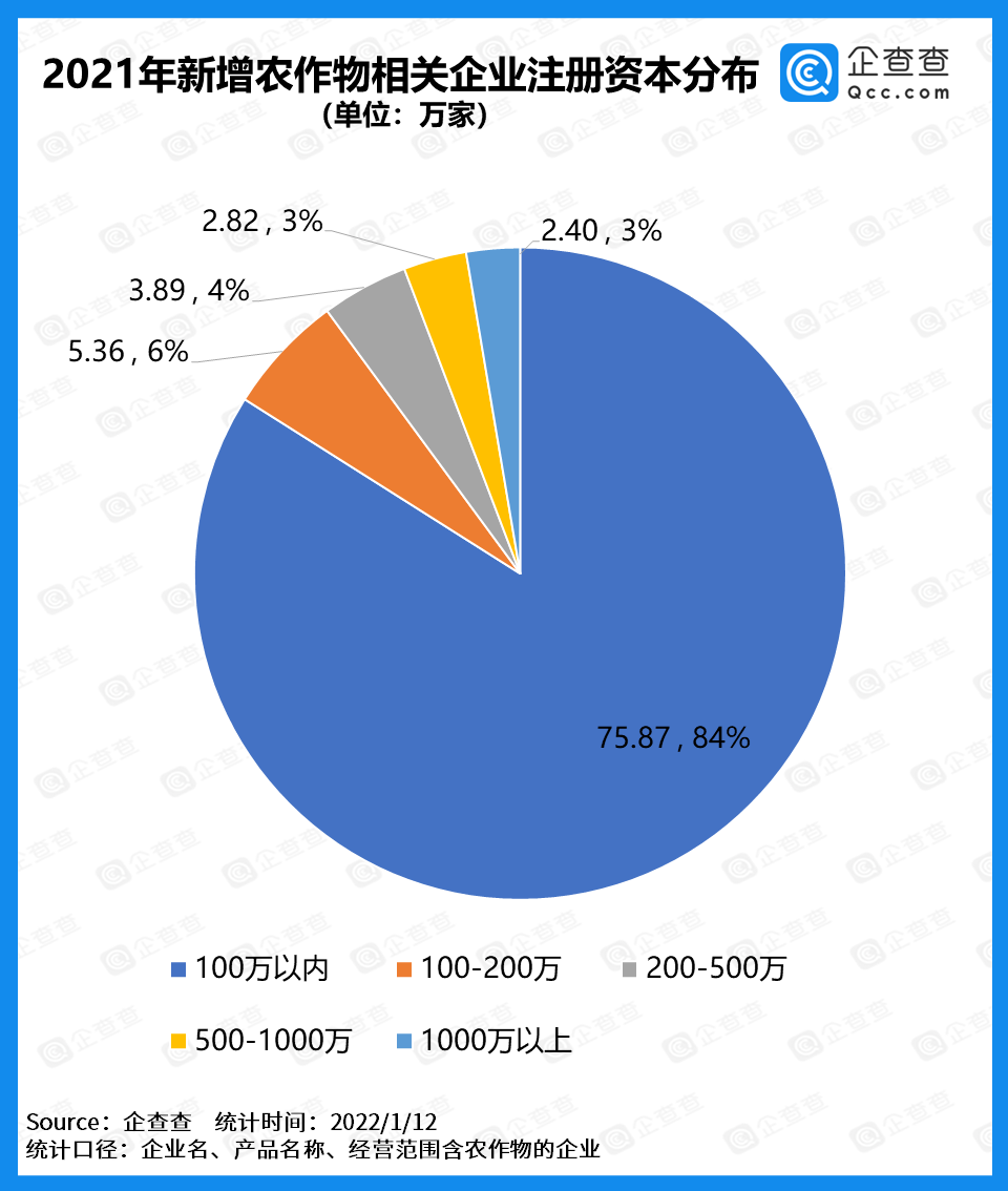 从注册资本来看,企查查数据显示,2021年注册资本在100万以内的农作物相关企业有75.87万家(包含个体户),占比84%。中央一号文件提出,推进现代农业经营体系建设,特别是要突出抓好家庭农场和农民合作社两类经营主体,鼓励发展多种形式适度规模经营,发展壮大农业专业化社会化服务组织,将先进适用的品种、投入品、技术、装备导入小农户。这75.87万个体户及注册资本小于100万的小微企业值得关注。