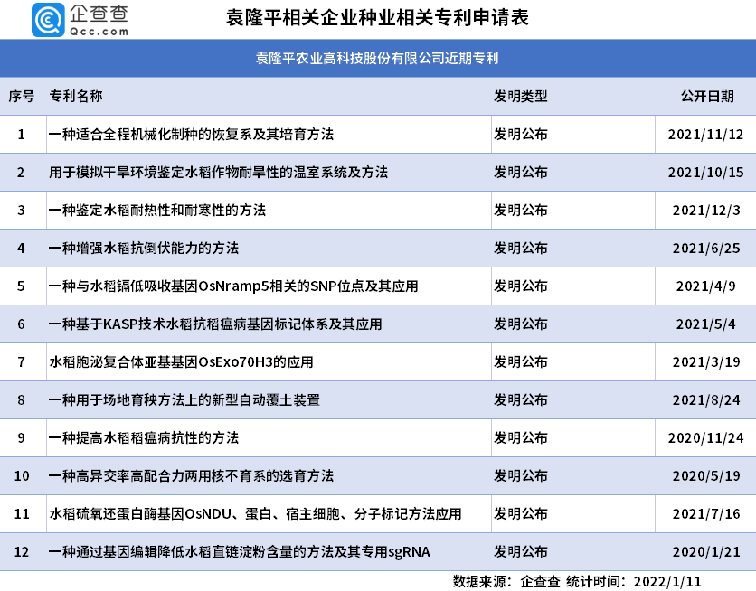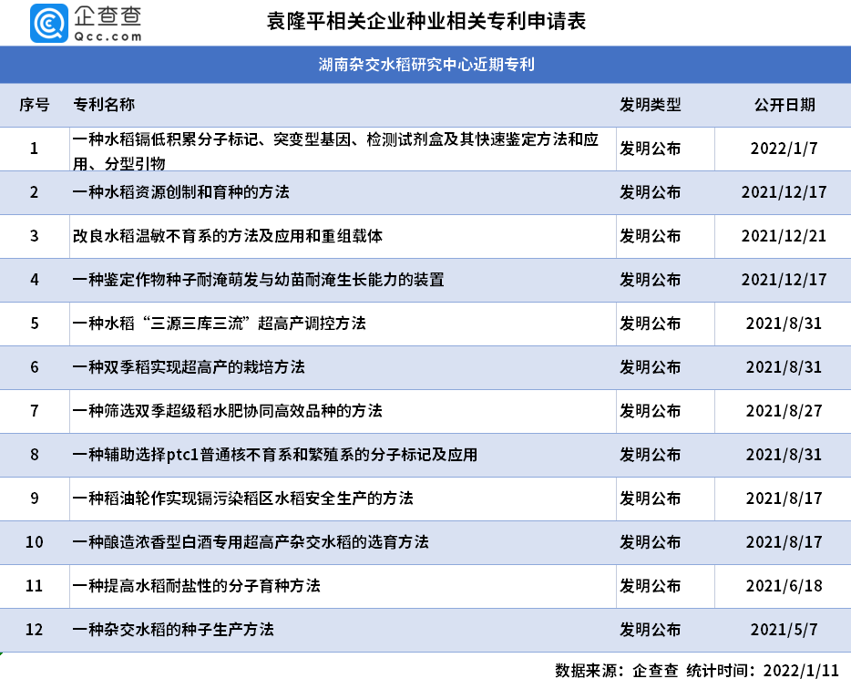 企查查数据研究院整理了袁隆平相关的专利,其中袁隆平相关企业湖南杂交水稻研究中心共有专利288件,发明公布205件,发明授权68件,实用新型15件;袁隆平农业高科技股份有限公司,共有专利111件,发明公布66件,发明授权32件,实用新型11件。