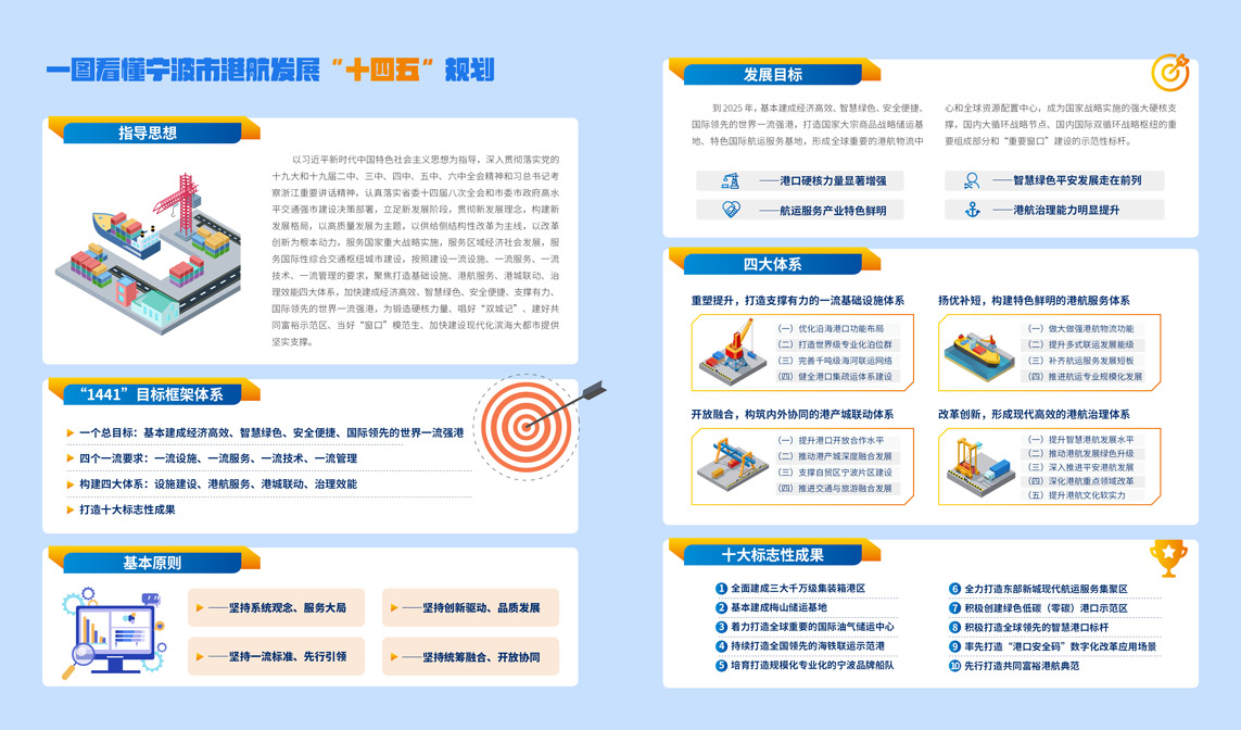12月26日,宁波市交通运输局审议通过《宁波市港航发展“十四五”规划》,确立了以基本建成经济高效、智慧绿色、安全便捷、国际领先的世界一流强港为总目标,按照建设一流设施、一流服务、一流技术、一流管理的四个一流要求,构建设施建设、港航服务、港城联动、治理效能四大体系,重点打造十大标志性成果的“1441”总体框架。