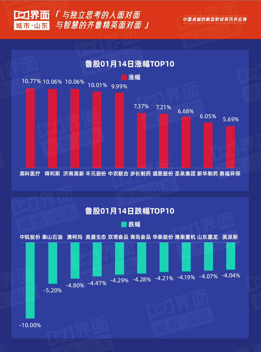 1月14日,山东84股上涨,3股持平,174股下跌。