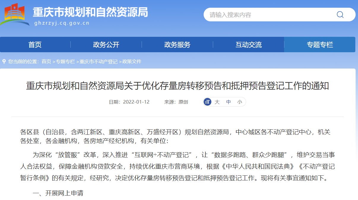 1月12日,重庆市规划和自然资源局发布《关于优化存量房转移预告和抵押预告登记工作的通知》,从即日起,所有二手房交易将实行预登记制度。