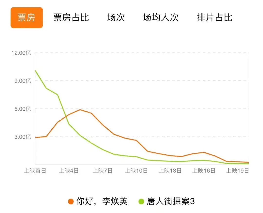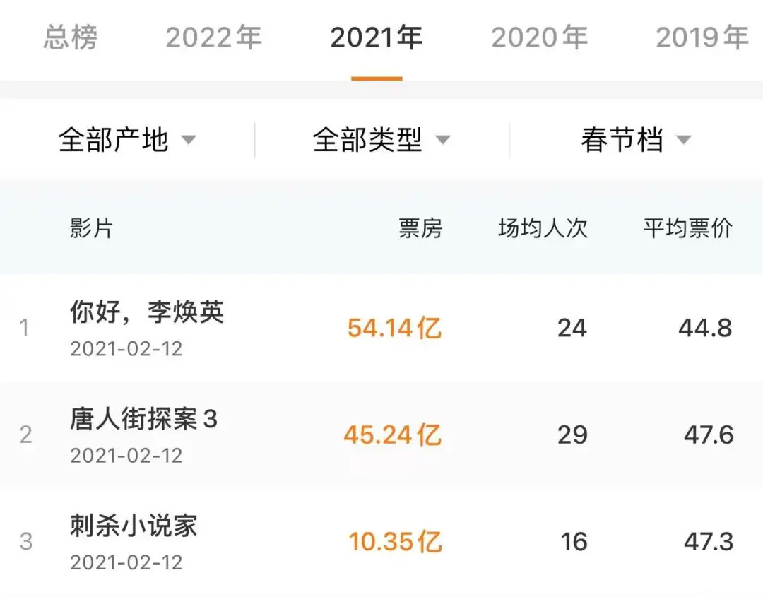 过去多年的春节档总有一个“魔咒”:映前热度和预售最高的片子,有很大的概率保不住冠军地位。比如去年的《唐人街探案3》,首日票房超10亿,是第二名的《你好!李焕英》的3倍有余,但从大年初四开始,单日票房便遭到了反超。