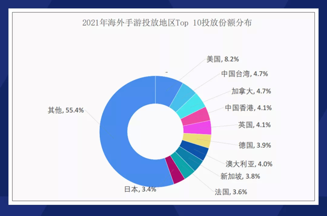 日前,App Growing发布了2021年全球手游买量白皮书。整个2021年,国内全网共有2亿多条手游相关的广告在投,同比2020年增长高达222%,在所有行业中移动广告投放数占比第一。而在全球视角下,2021年投放手游广告超过1170万组,同比增长达到64%。从投放份额来看,美国、新加坡、加拿大、台湾等地皆是手游集中投放的地区。