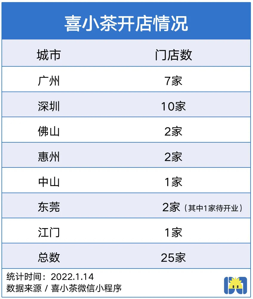 喜小茶是2020年推出的子品牌,客单价在13元-16元,主要对标一点点、coco都可的价位。2021年5月,喜小茶发布数据,称用一年时间在广东6大城市(深圳、广州、东莞、中山、佛山和惠州)开出22家门店。