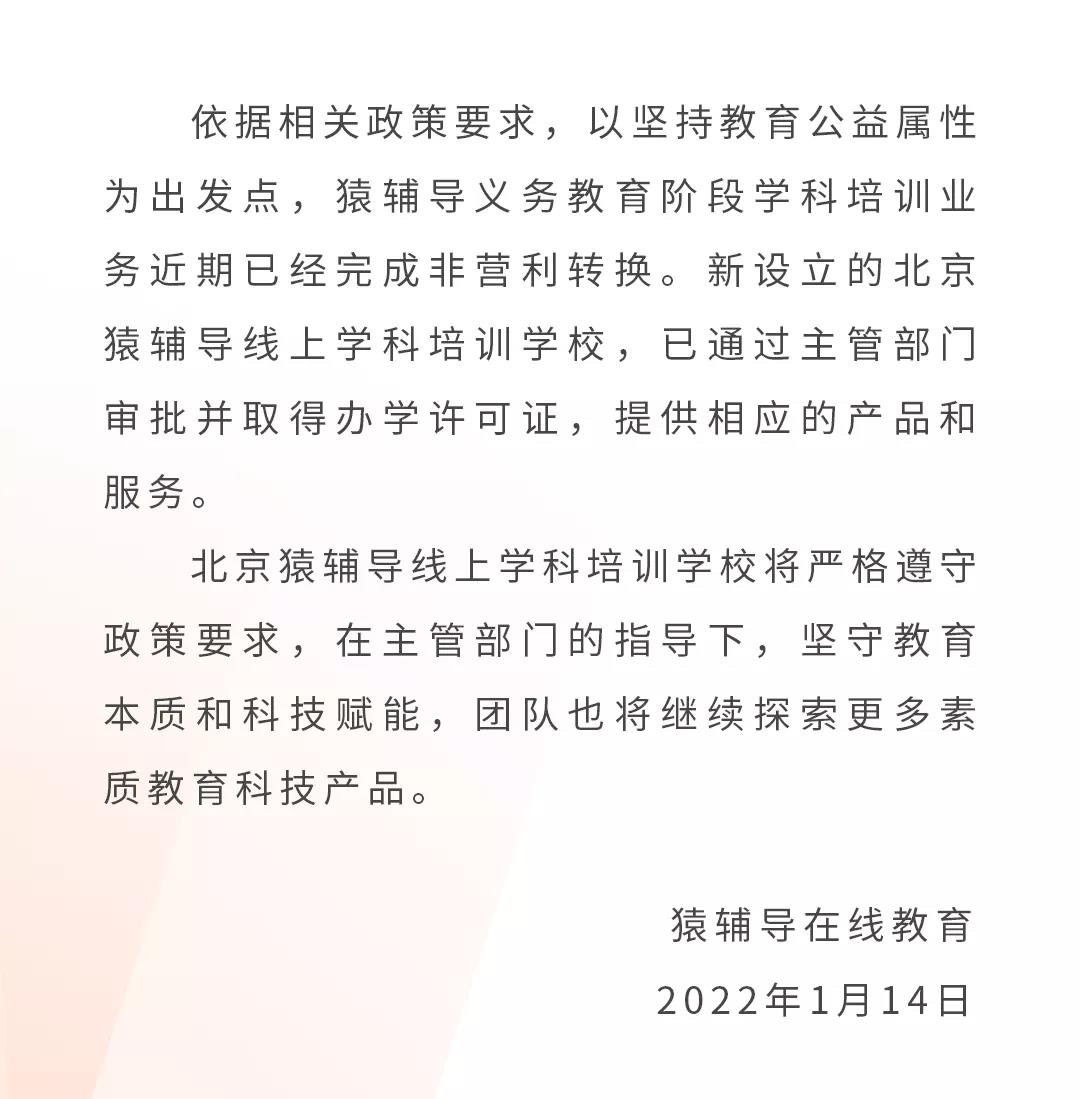 “猿辅导”微信公众号消息,猿辅导在线教育1月14日发布通知称,依据相关政策要求,以坚持教育公益属性为出发点,猿辅导义务教育阶段学科培训业务近期已经完成非营利转换。新设立的北京猿辅导线上学科培训学校,已通过主管部门审批并取得办学许可证,提供相应的产品和服务。