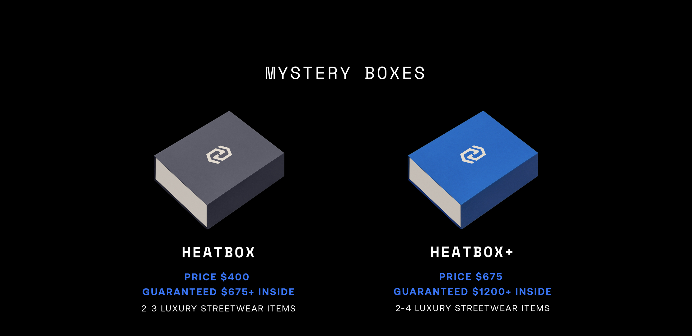 界面时尚在HEAT官网看到,该平台目前孵化的盲盒分为两类,一类是灰色图标的盲盒,售价400美元,内含2至3件奢侈品单品,市场价值为675美元。另一种是蓝色图标的盲盒,售价为675美元,内含2至4件单品,市场价值1200美元。