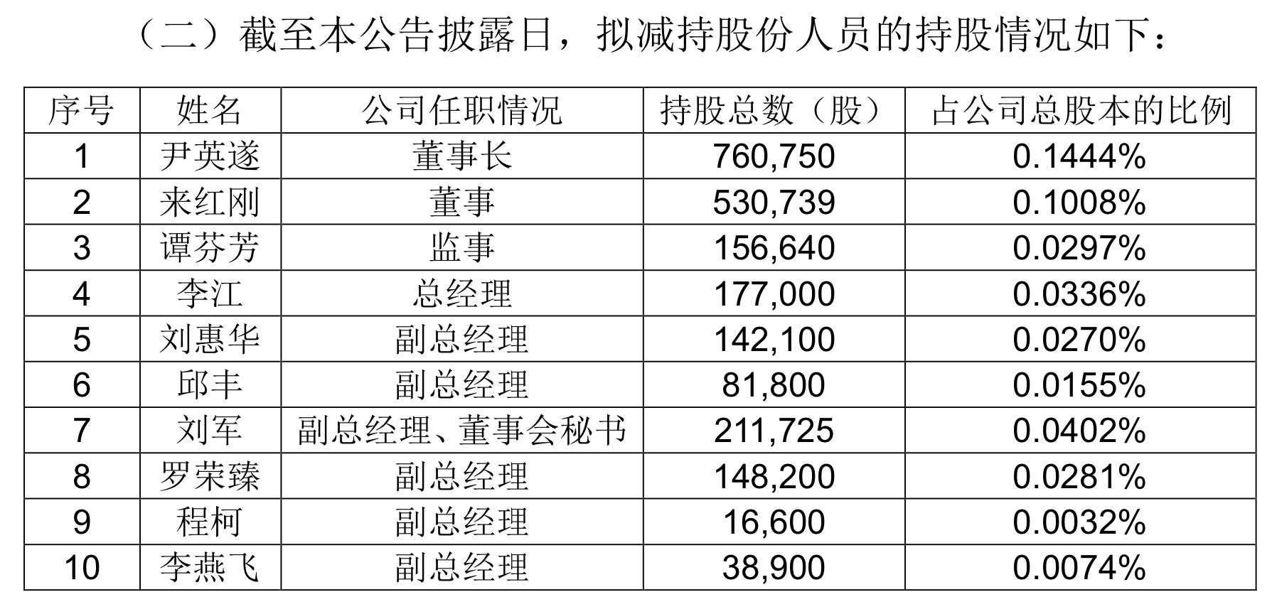 2022年1月4日,董事长尹英遂、董事来红刚、监事谭芬芳、总经理李江、副总经理刘惠华、副总经理邱丰、副总经理/董事会秘书刘军、副总经理罗荣臻、副总经理程柯、副总经理李燕飞发来《股东减持计划告知函》,也计划在6个月内减持56.3615万股,占总股本比例0.107%,至于减持原因为“个人资金需求”。