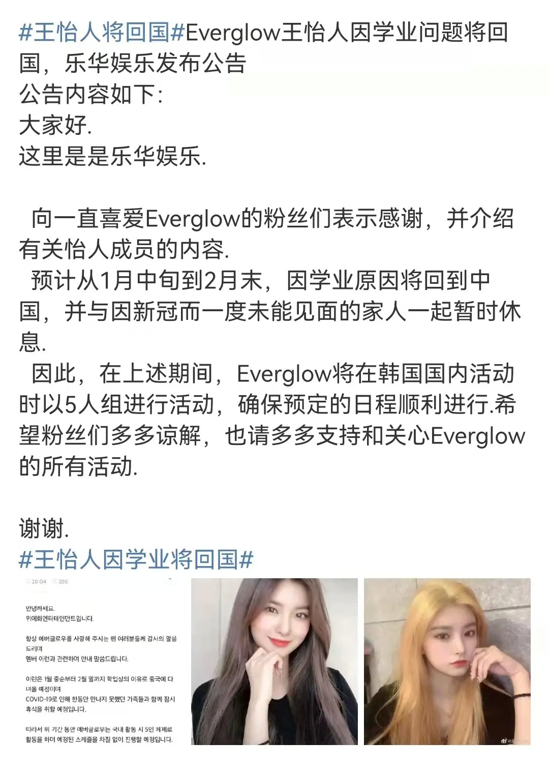 虽然王怡人的举动在韩国备受争议,但却得到了国内网友的一致力挺,不少网友呼吁其回国发展。随后,EVERGLOW所属的经纪公司乐华娱乐对外发布公告表示,王怡人因为学业原因即将回国,接下来EVERGLOW会以5人组的形式进行活动。选择在此时回国是否受到了舆论影响,我们不得而知,但避开风口浪尖的争议无疑是个明智之举。