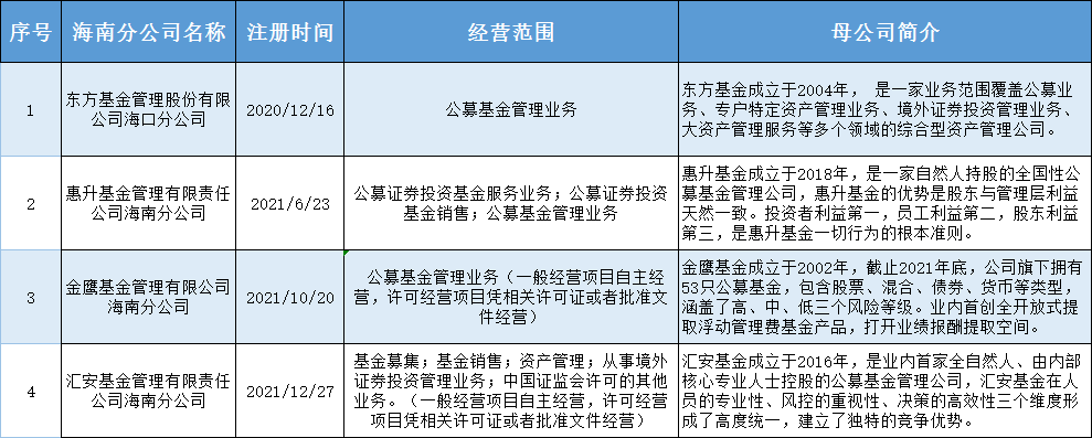 据记者统计,2020年12月-2021年12月,共有4家国内公募基金管理公司在海南注册分公司,分别是东方基金管理股份有限公司、惠升基金管理有限责任公司、金鹰基金管理有限公司、汇安基金管理有限责任公司。值得一提的是,其中有3家都是在2021年6月以后注册的。