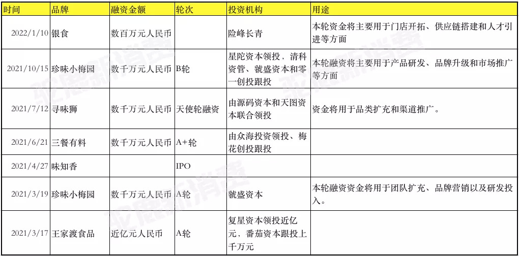 不过,预制菜的爆发,并非一日之功。早在2021年双11期间,预制菜就成为天猫十大趋势单品之一。嗅觉敏锐的资本家也早在开始布局,据驼鹿新消费统计,2021年至少有5家相关领域企业获得了7起融资。