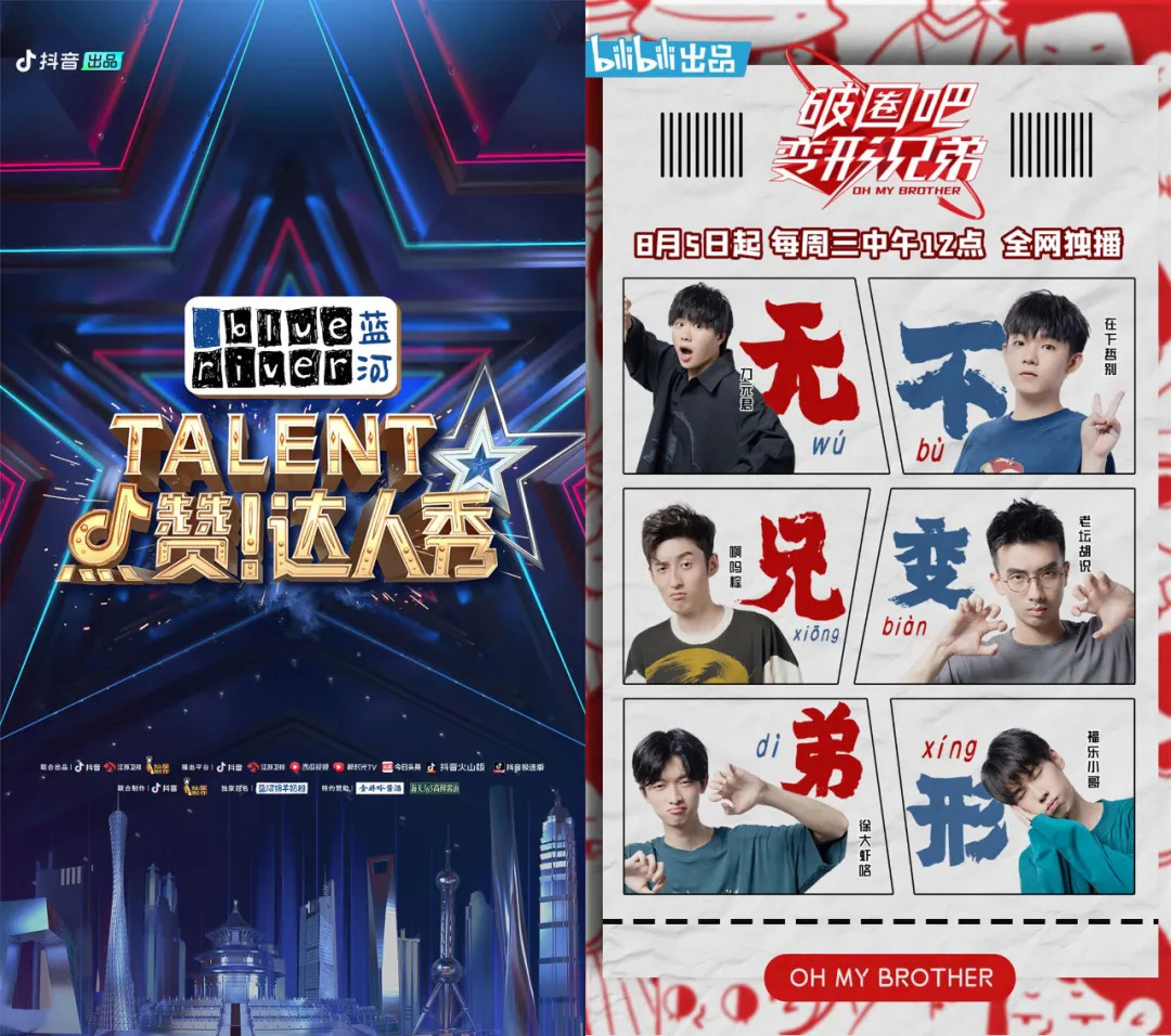 其次是明星达人生态,不但和诸多明星形成了稳定合作关系,平台达人也可以在节目中发挥作用,比如抖音的《点赞!达人秀》就和达人深度联动,B站也有《UP主变形记》《破圈吧变形兄弟》等多档UP主真人秀。