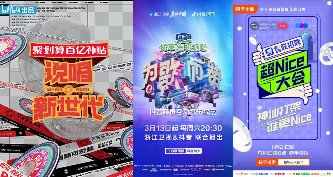 长综艺领域,B站早在2020年就推出了口碑出圈的自制综艺《说唱新世代》;抖音和快手则在去年普遍发力,前者推出了《因为是朋友呀》《很高兴认识你2》《为歌而赞》等多款节目,快手则和笑果合作《超nice大会》。