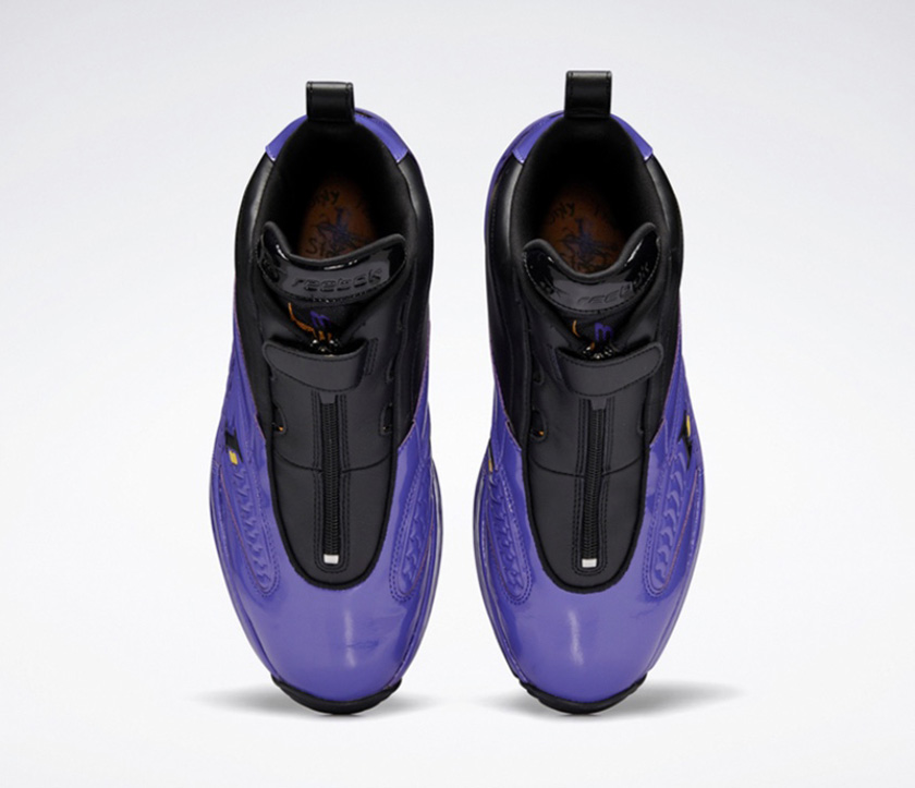 据介绍,ANSWER IV“LAKERS”采用隐藏式系带系统,鞋面由皮革和合成牛巴革制成,搭配DMX缓震中底。整体采用紫+黄+黑的配色,鞋面为大面积紫色漆皮和黑色皮面材质,鞋底碳板则替换成金黄色,还印有艾弗森头像。