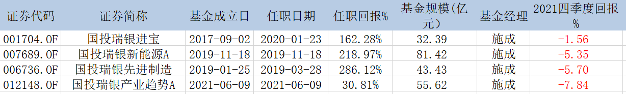 具体到业绩来看,国投瑞银产业趋势去年四季度的回报率为-7.84%,国投瑞银先进制造的同期回报率为-5.7%,国投瑞银新能源的同期回报率为-5.35%,国投瑞银进宝的同期回报率为-1.56%。Wind数据显示,自去年9月16日以来,上述四只基金的净值回撤幅度均超过30%。