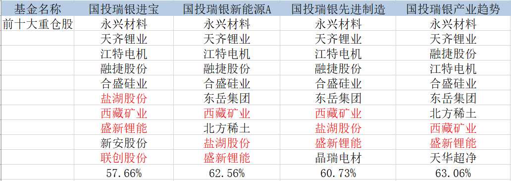 具体到持仓来看, 施成管理的4只基金依然投向新能源赛道为主,持股集中度较高,且偏向新能源上游。这一点,与三季度相比,并未出现明显变化,只是对于上游资源品更为看重。 相比三季度,四只基金前十大重仓股中,新增了盐湖股份(000792.SZ)、西藏矿业(000762.SZ)、盛新锂能(002240.SZ)等个股。 联泓新科(003022.SZ)、新安股份(600596.SH)、晶瑞电材(300655.SZ)则淡出前十大重仓股。