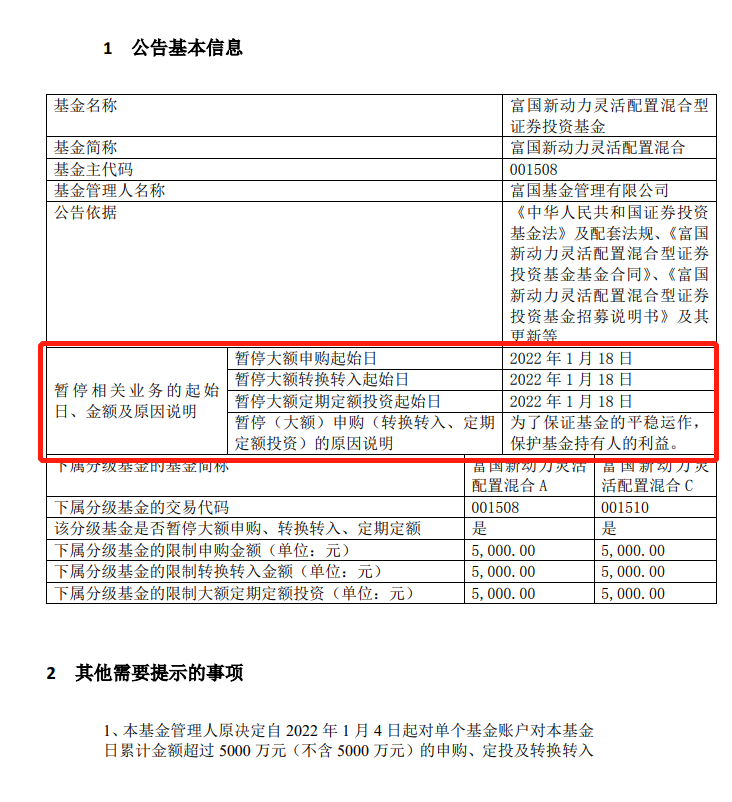 除了基金经理变更外,在于洋接任后的第5天,富国新动力宣布将单日大额申购额度控制在5000万元;而在1月15日,该基金再次宣布限购,自1月18日起单日限购额度控制在5000元以下。对此,公告表示“是为了保证基金平稳运作,维护持有人的利益”。