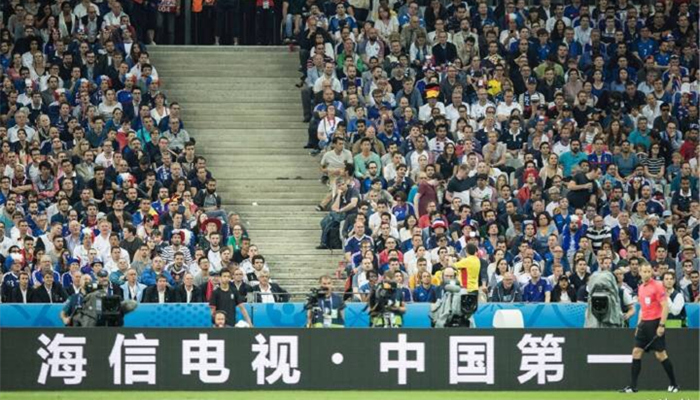 在欧洲杯正进行得火热的时候,不少中国球迷的注意力却被赛场围栏上的一条中文广告吸引:海信电视,中国第一。
