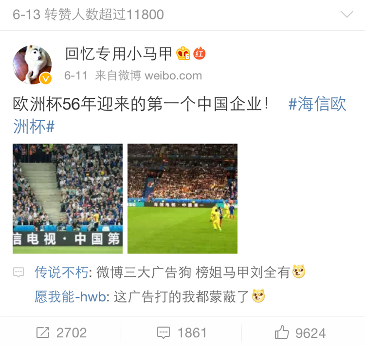海信对这个赚足眼球的广告显得信心十足。因为它是56年来欧足联首个来自中国的顶级赞助商,海信和欧足联签署了2年合约,砸下4000万到6000万欧元才获得了欧洲杯广告席位,和可口可乐、麦当劳等欧足联长期合作伙伴共同出现在赛场内。每场比赛中,海信广告将出现8分钟。
