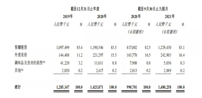 具体来看,2019年、2020年及2021年前三季度,七欣天的餐厅运营的收入分别为10.97亿元、11.91亿元和12.29亿元,分别占其总收入的85.4%、83.5%和83.1%;外卖业务收入分别为1.44亿元、2.21亿元和2.43亿元,占比分别为11.2%、15.5%和16.4%。