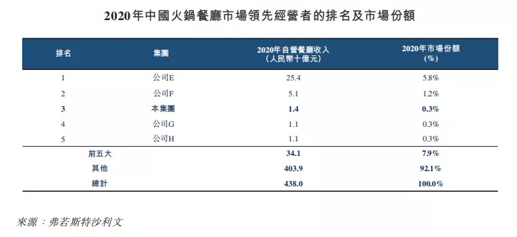 事实上,从整体竞争格局来看,中国火锅餐厅市场高度分散,2020年有火锅餐厅约50万至60万家。根据咨询机构“弗若斯特沙利文”的资料,从2020 年收入来看,中国火锅餐厅市场排名前五的经营者约占市场份额的7.9%。