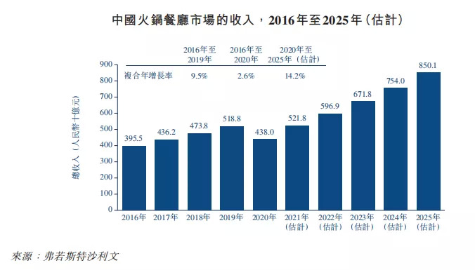 而从整个行业来看,火锅餐厅的收入由2016年的3955亿元,增加到了2020年的4380亿元,复合年增长率为2.6%,预计2020年至2025年,中国火锅餐厅预期复合年增长率达到14.2%,呈现稳步增长态势。