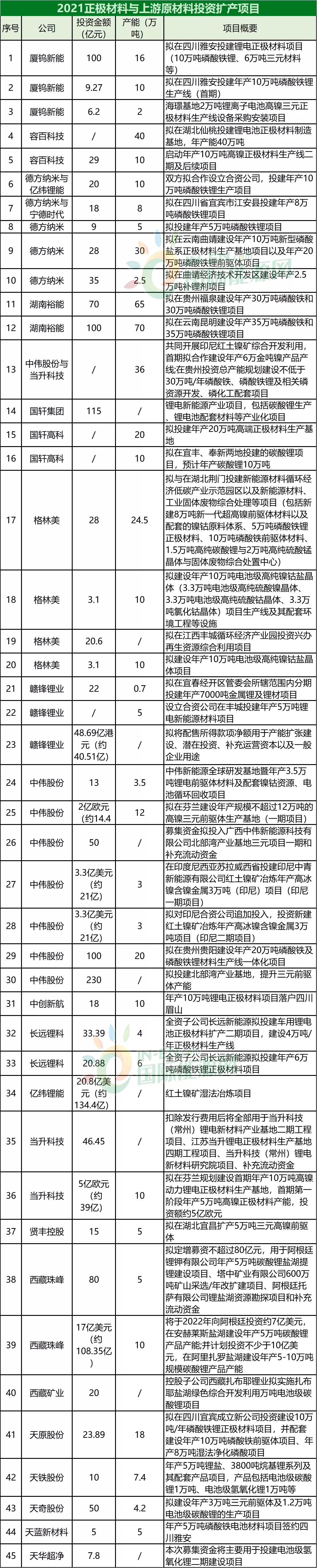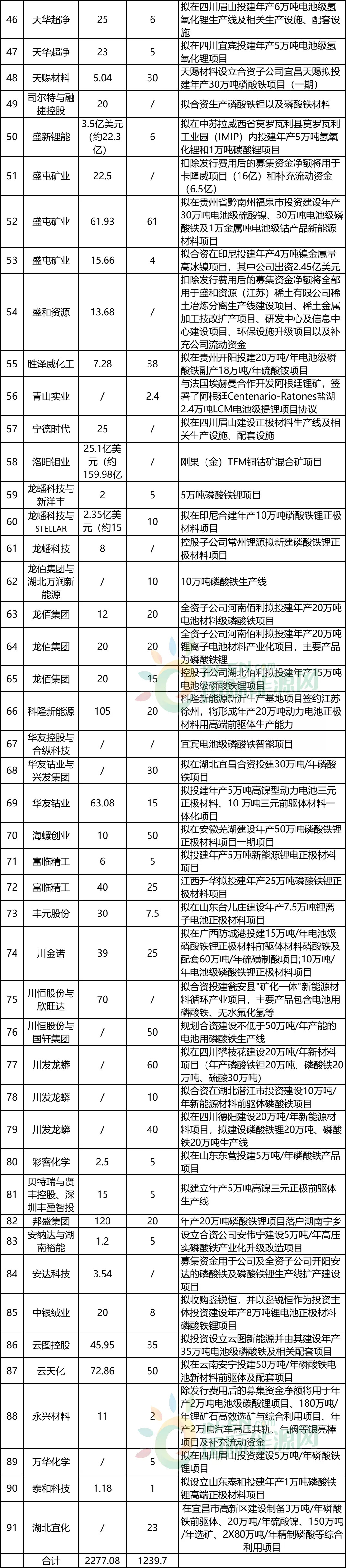 在正极材料及上游原材料领域,91个项目公布了投资额的项目中,公布了产能数字的项目总计总计1239.7万吨,投资总额约2277.08亿元。
