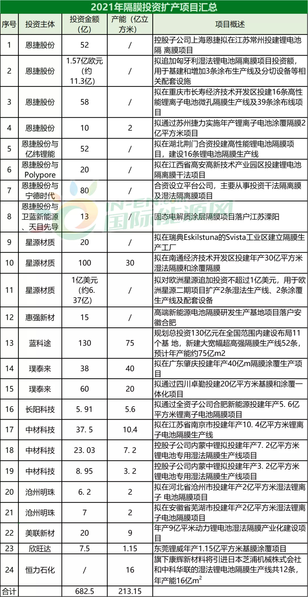 在隔膜领域24个项目中,在公布了产能数字的项目中产能总计123.15亿平方米,投资总额约682.5亿元。这个也是产业集中度相当高的领域,恩捷股份、星源材质、中材科技等牢牢站在前排,无论是产能还是投资额。